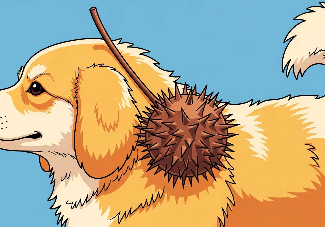 A prickly seed case or flower head that clings to clothing and animal fur.