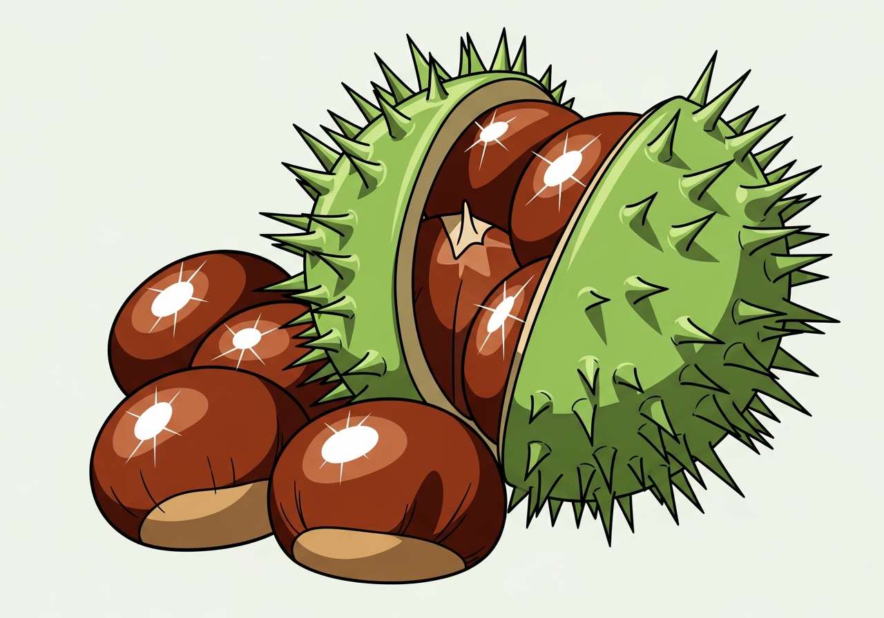 A glossy, hard, brown edible nut that develops within a bristly case and is produced by a large deciduous tree.