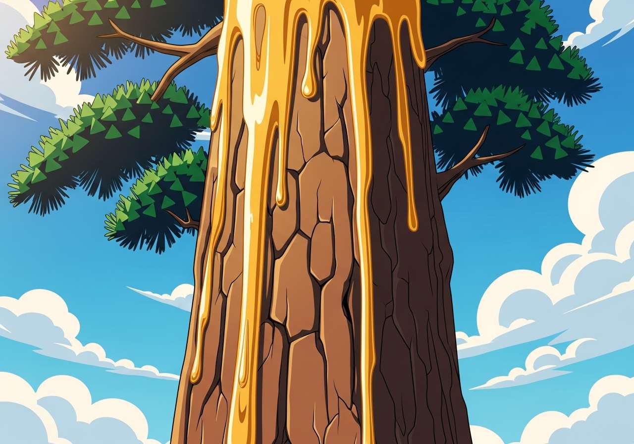 The pine tree produces a sticky resin that hardens when exposed to air.