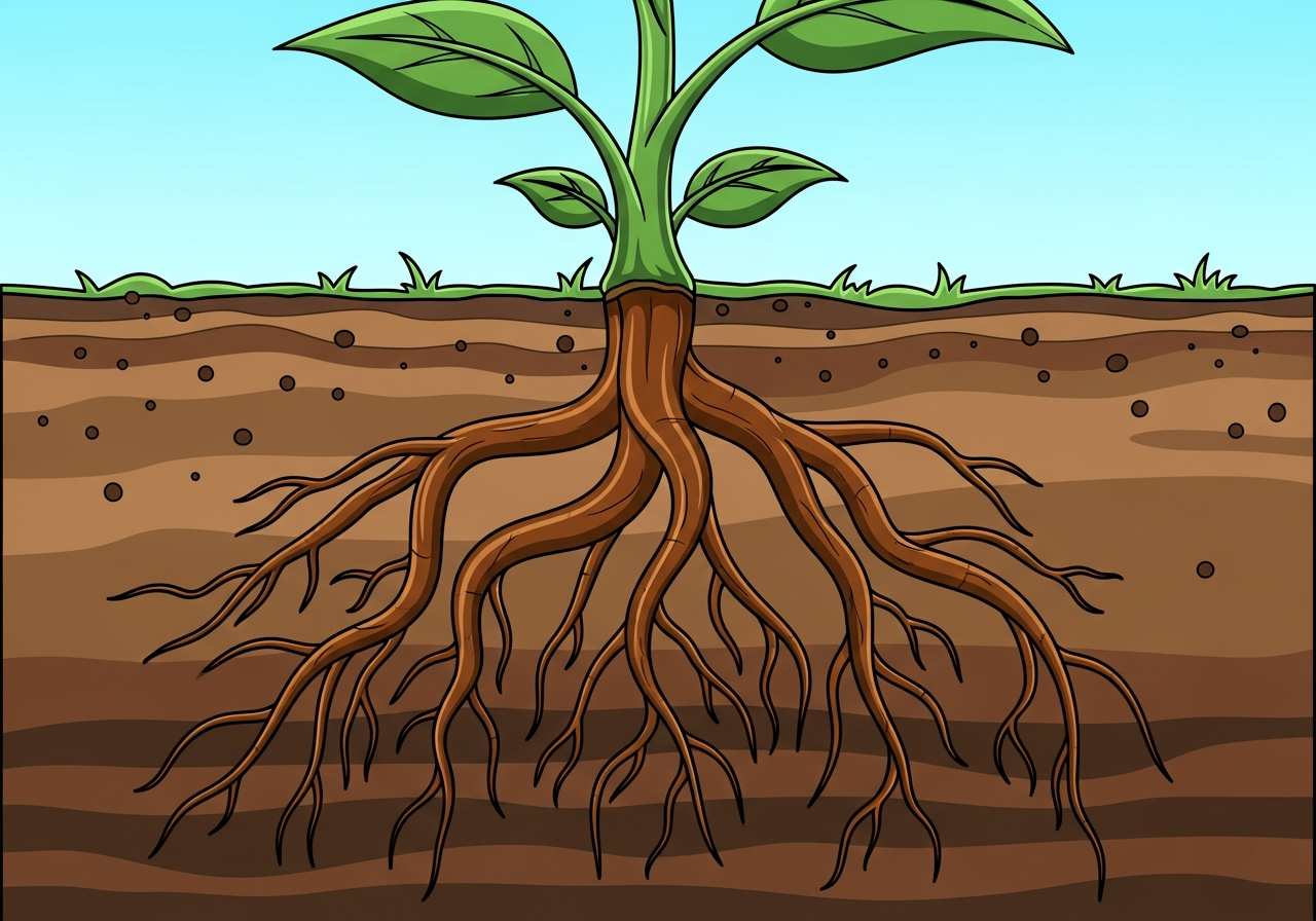The part of a plant that grows underground and absorbs water and nutrients from the soil.
