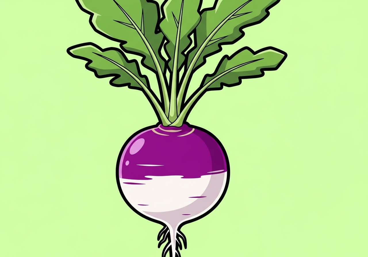 A round root vegetable with white or cream-colored flesh and a purple, red, or greenish top, commonly eaten cooked or raw.
