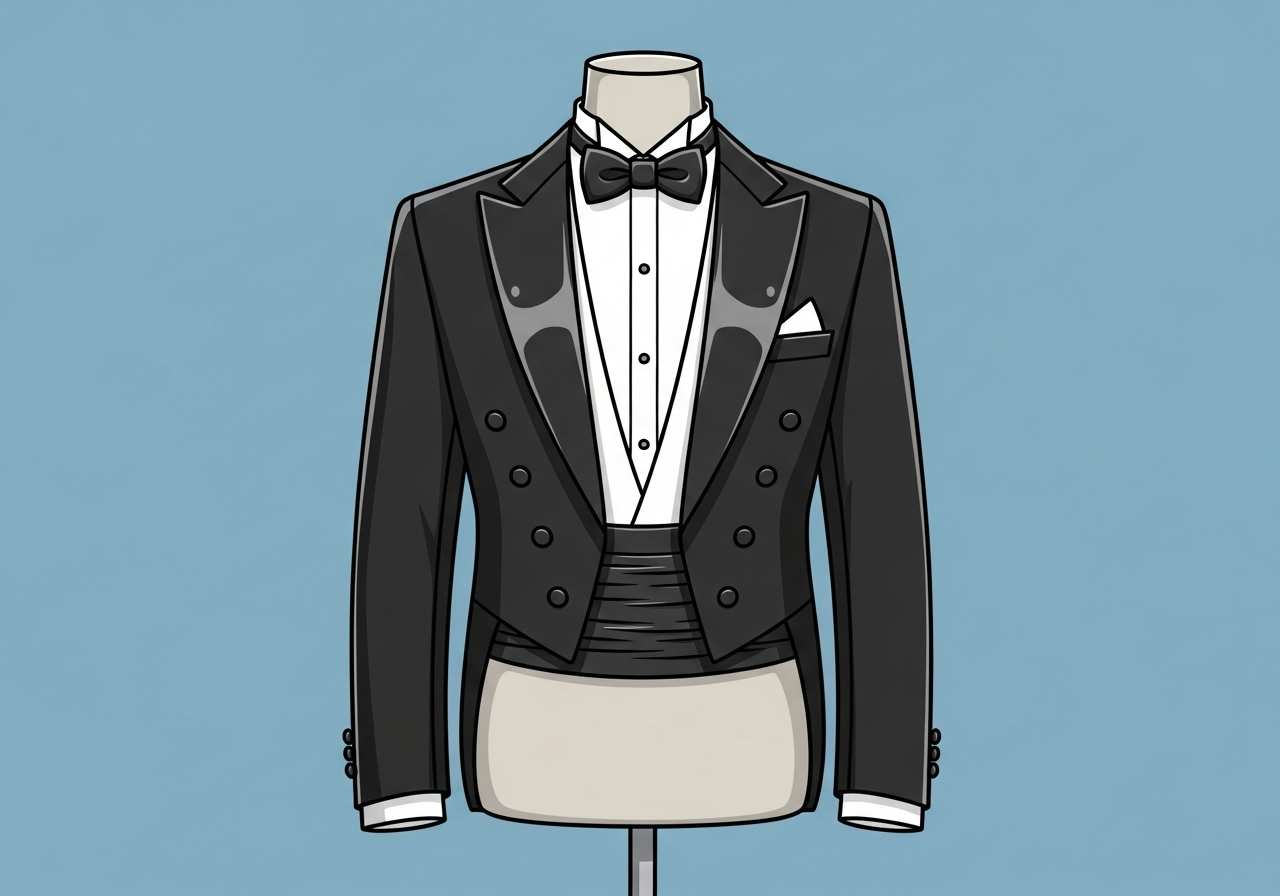 A man's formal evening suit with a jacket that typically has satin lapels, worn with a bow tie for special occasions